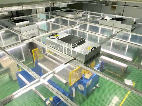 風機從FFU頂部將空氣吸入,經初效過濾器,高效過濾器過濾,過濾后的潔凈空氣在整個出風面以0.45m/+20%的風速勻速送出到深圳無塵棚內。形成均流層,使潔凈空氣氣流呈垂直單向流,從而保證了工作區內所要求的潔凈度。