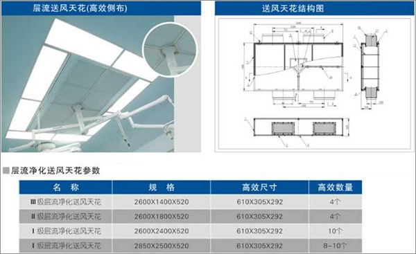 層流送風(fēng)天花是采用空氣潔凈技術(shù)對微生物污染采取程度不同的控制,達(dá)到控制空間環(huán)境中空氣潔凈度適于各類手術(shù)之要求;并提供適宜的溫、濕度,創(chuàng)造一個潔凈舒適的手術(shù)空間環(huán)境。